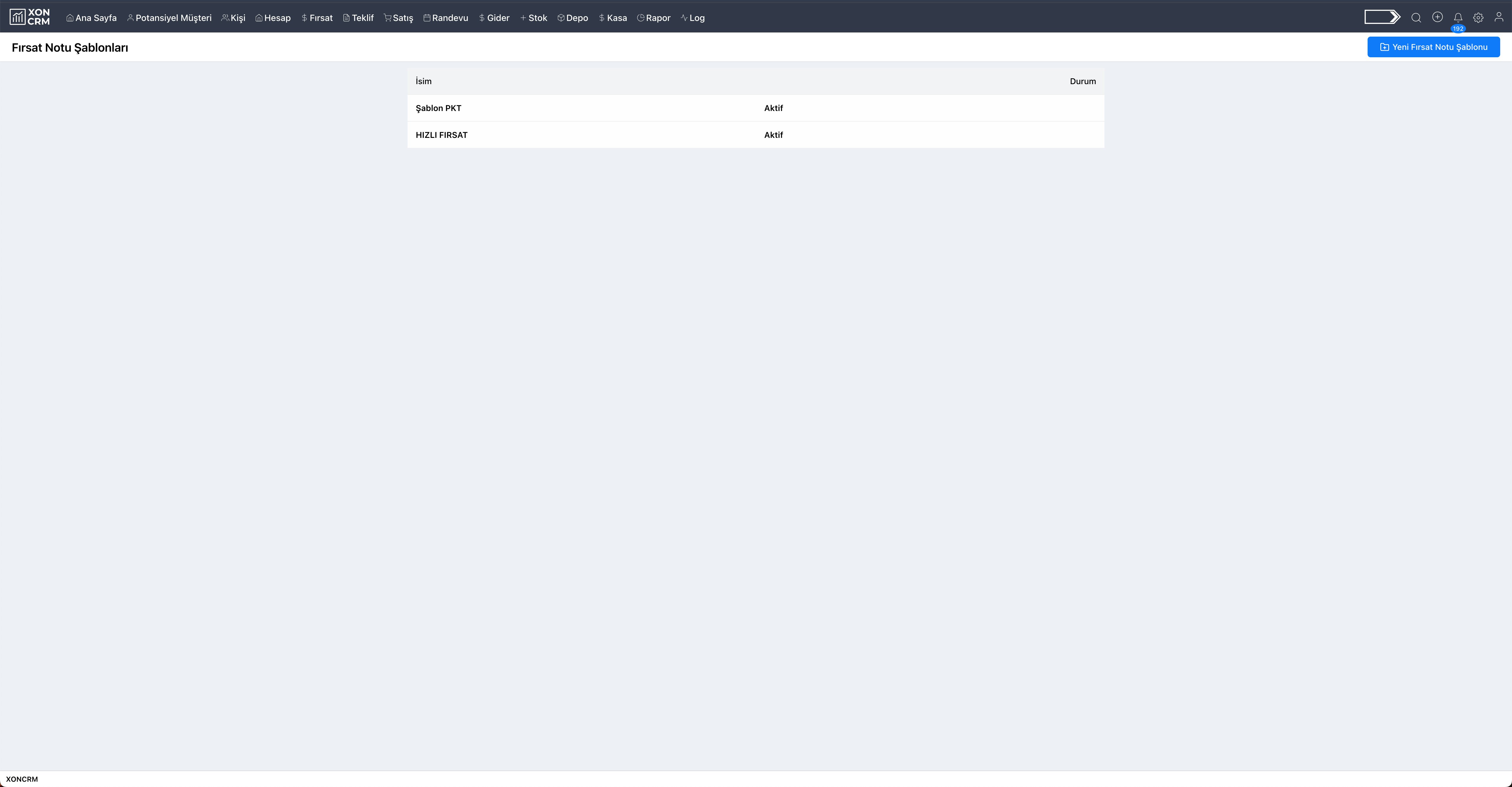 Açılan sayfada eklendi ise fırsat not şablonları listelenmektedir. Bu şablonlar şu bilgileri içerir: