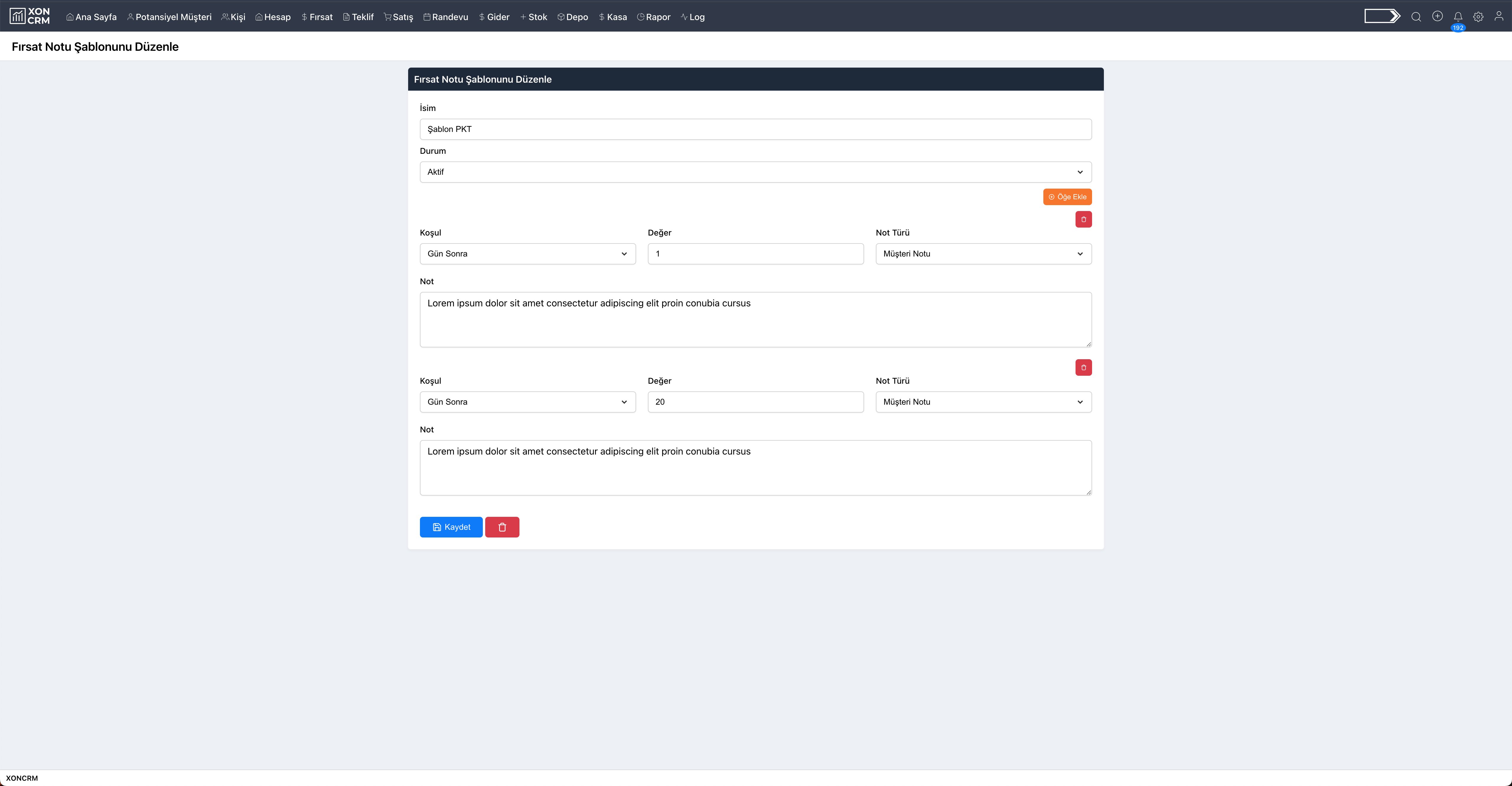 Yapılan değişikliği kaydetmek için, pencerede yer alan “Kaydet” butonuna tıklayınız. Fırsat not şablonunu silmek için ise kırmızı “Sil” ikonuna tıklayınız.