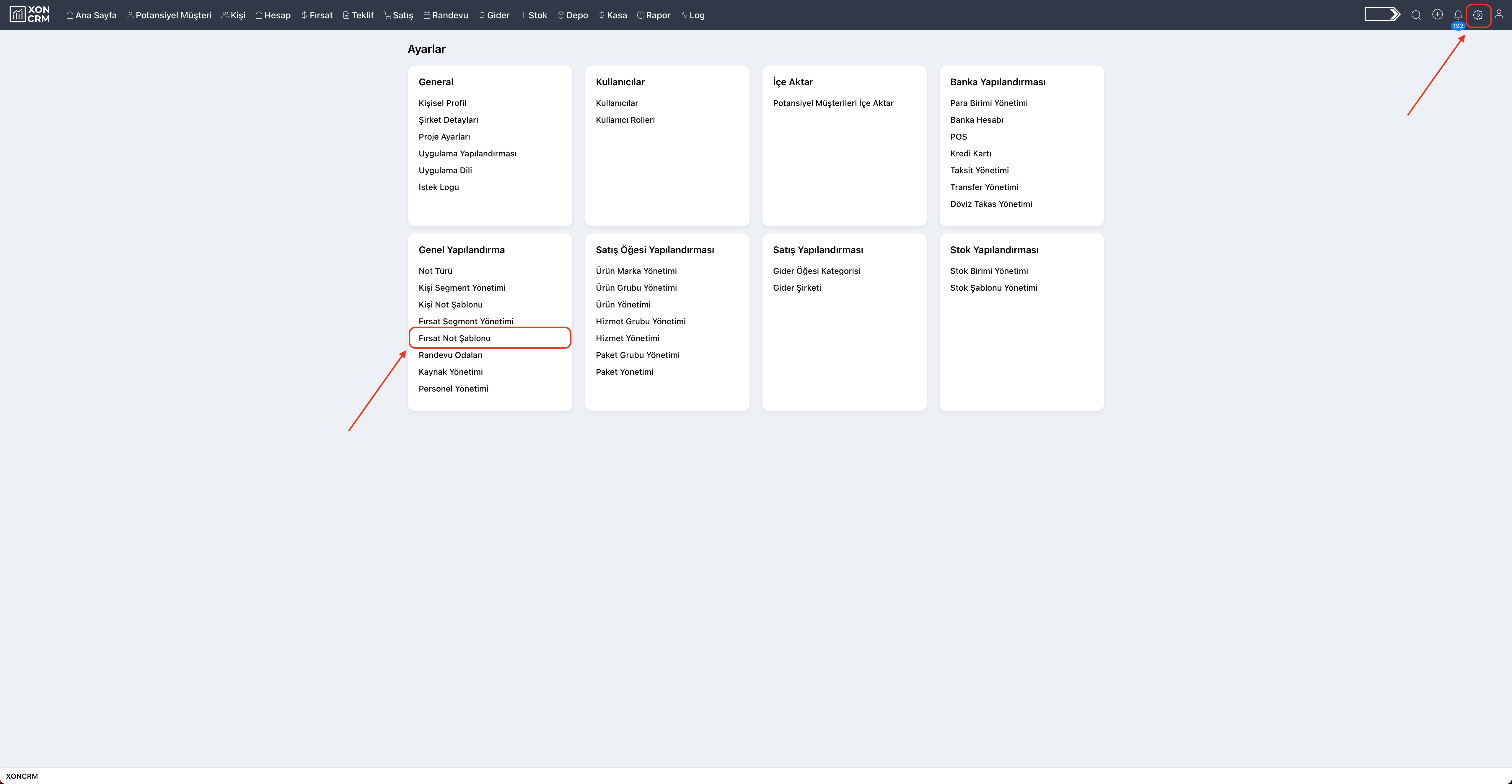 Fırsat not şablonları, fırsatlar notu oluşturma aşamasında kullanılırlar. Fırsat not şablonları sayesinde fırsat notları hızlı bir şekilde eklenebilmektedirler. Fırsat not şablonu sayfasında ise bu şablonların oluşturulması ve yönetilmesi sağlanmaktadır. Fırsat not şablonu sayfasını açmak için; ekranın sağ üst köşesinde yer alan “Ayarlar” ikonuna tıklayınız. Açılan sayfada yer alan Genel Yapılandırma bölümündeki “Fırsat Not Şablonu” seçeneğine tıklayınız.