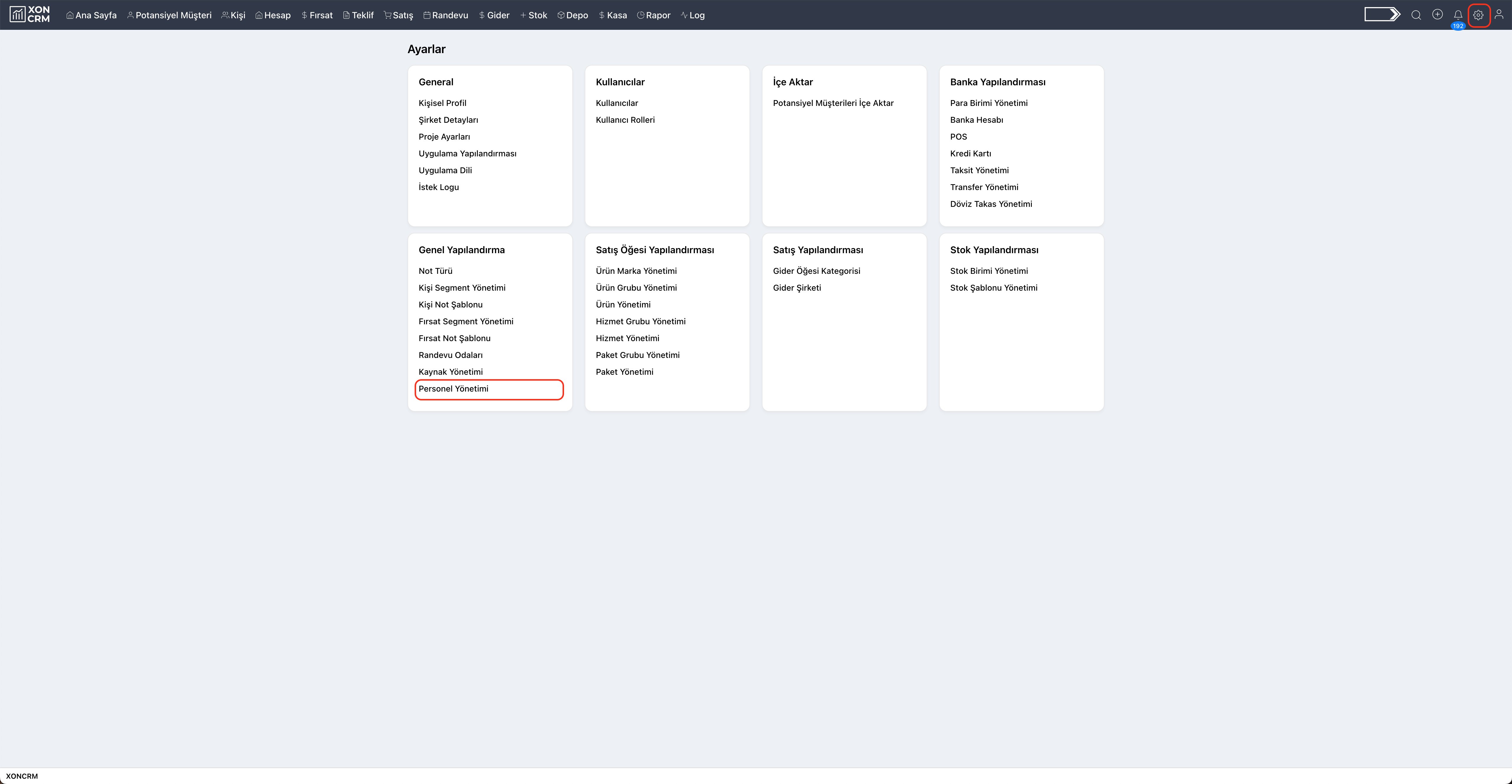 Personel Yöneyimi sayfasını açmak için; ekranın sağ üst köşesinde yer alan “Ayarlar” ikonuna tıklayınız. Açılan sayfada yer alan Genel Yapılandırma bölümündeki “Personel Yönetimi” seçeneğine tıklayınız.