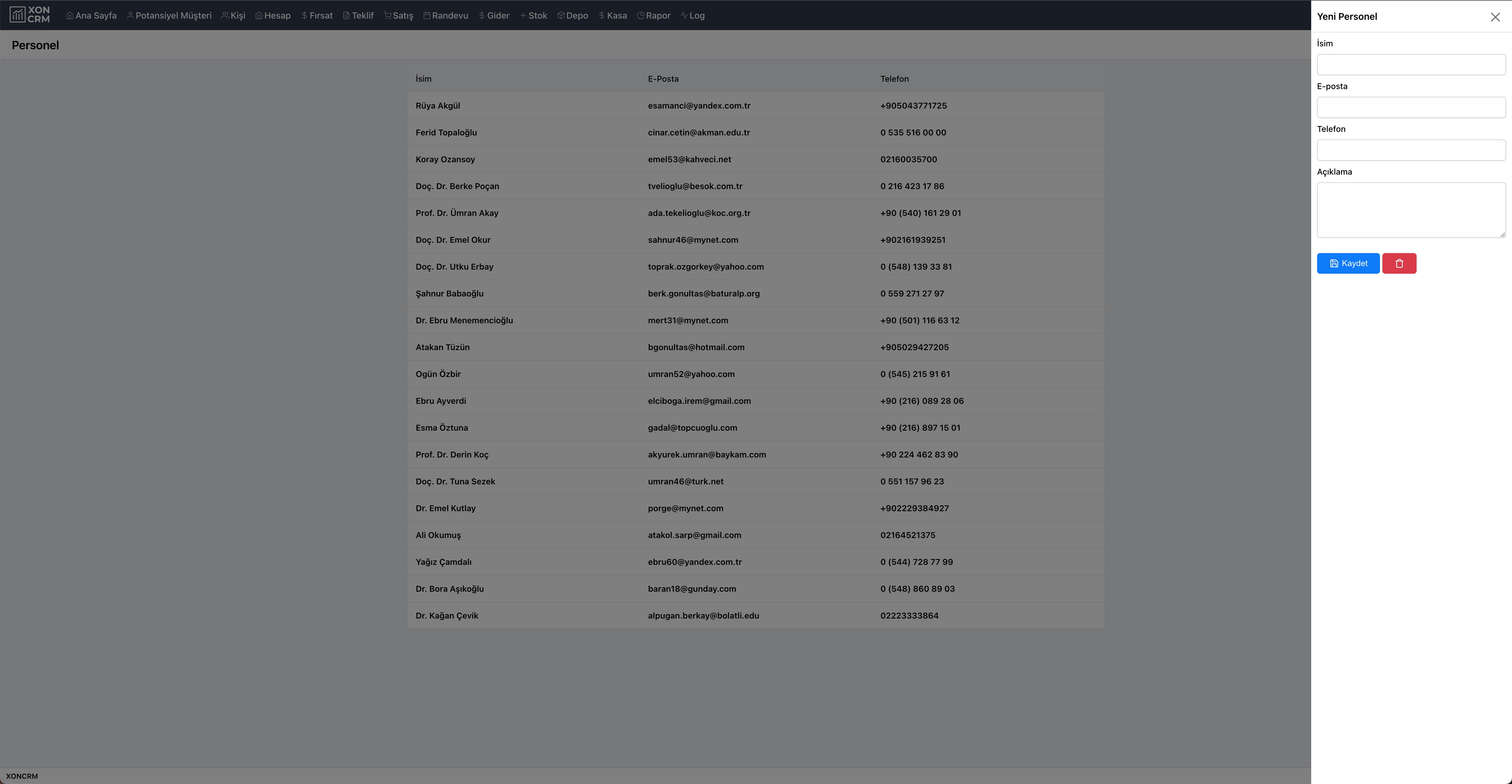 Ekli bir personel bilgisini güncellemek için; listede yer alan personelin üzerine tıklayınız. Sağda açılan pencereden personelin ismini, e-posta adresini, telefon numarasını ve açıklamasını güncelleyebilirsiniz. Yapılan değişikliği kaydetmek için, pencerede yer alan “Kaydet” butonuna tıklayınız. Kayıtlı bir personeli silmek için ise kırmızı “Sil” ikonuna tıklayınız.