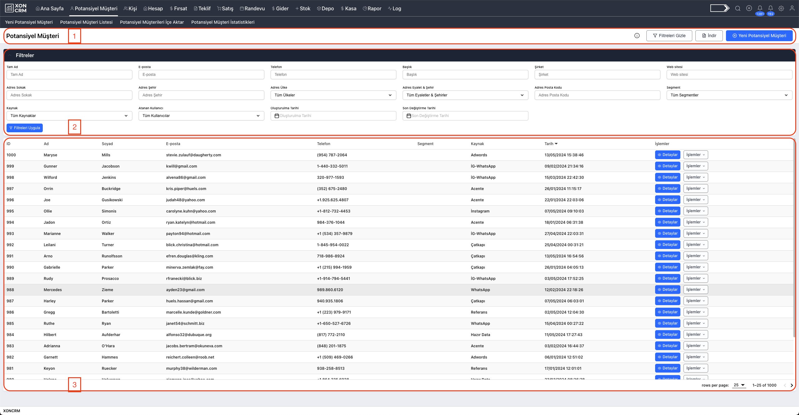 - Telefon: Potansiyel müşterileri kayıtlı telefon numarasına göre filtreleme uygular.