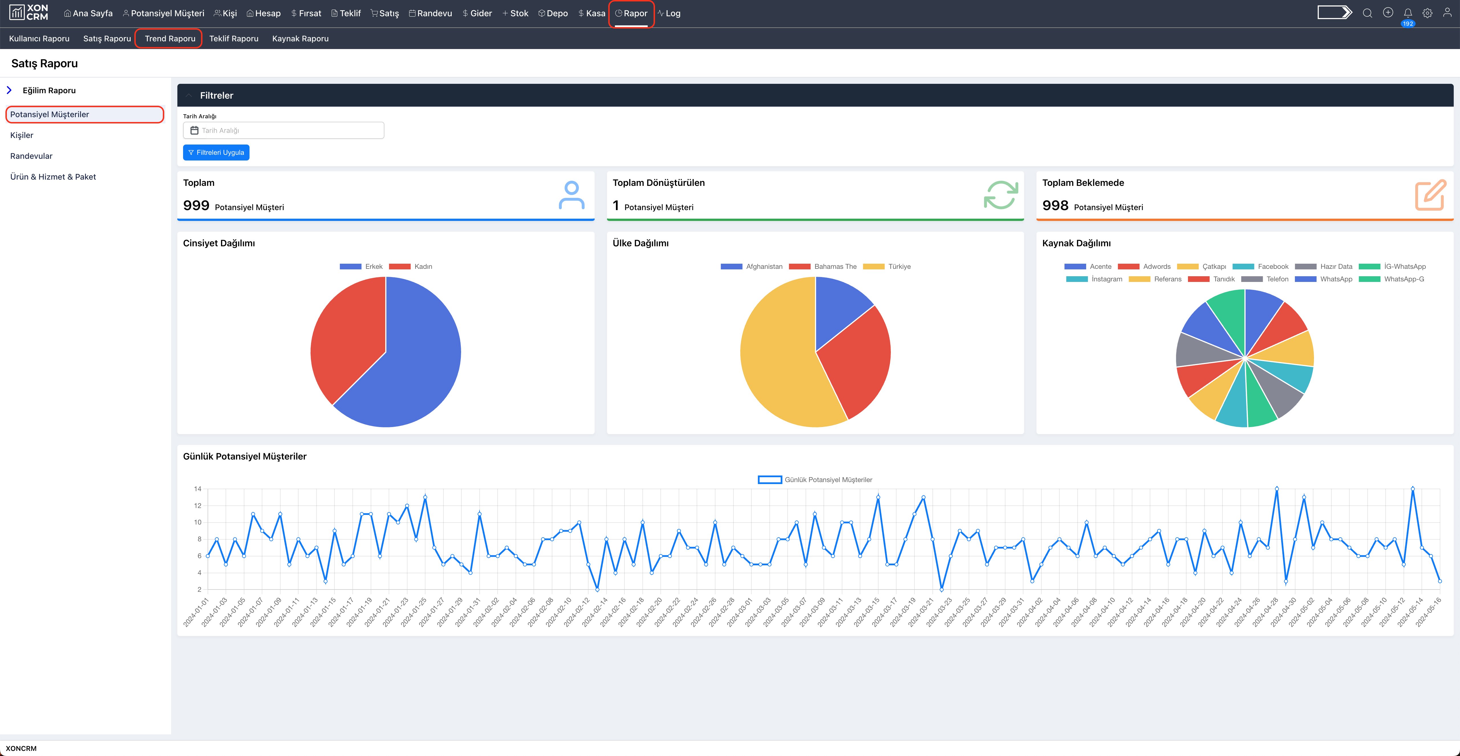 Bu sayfadan potansiyel müşterilerin genel eğilim raporu incelenebilmektedir. Bu sayfada yer alan bölümler sırasıyla: