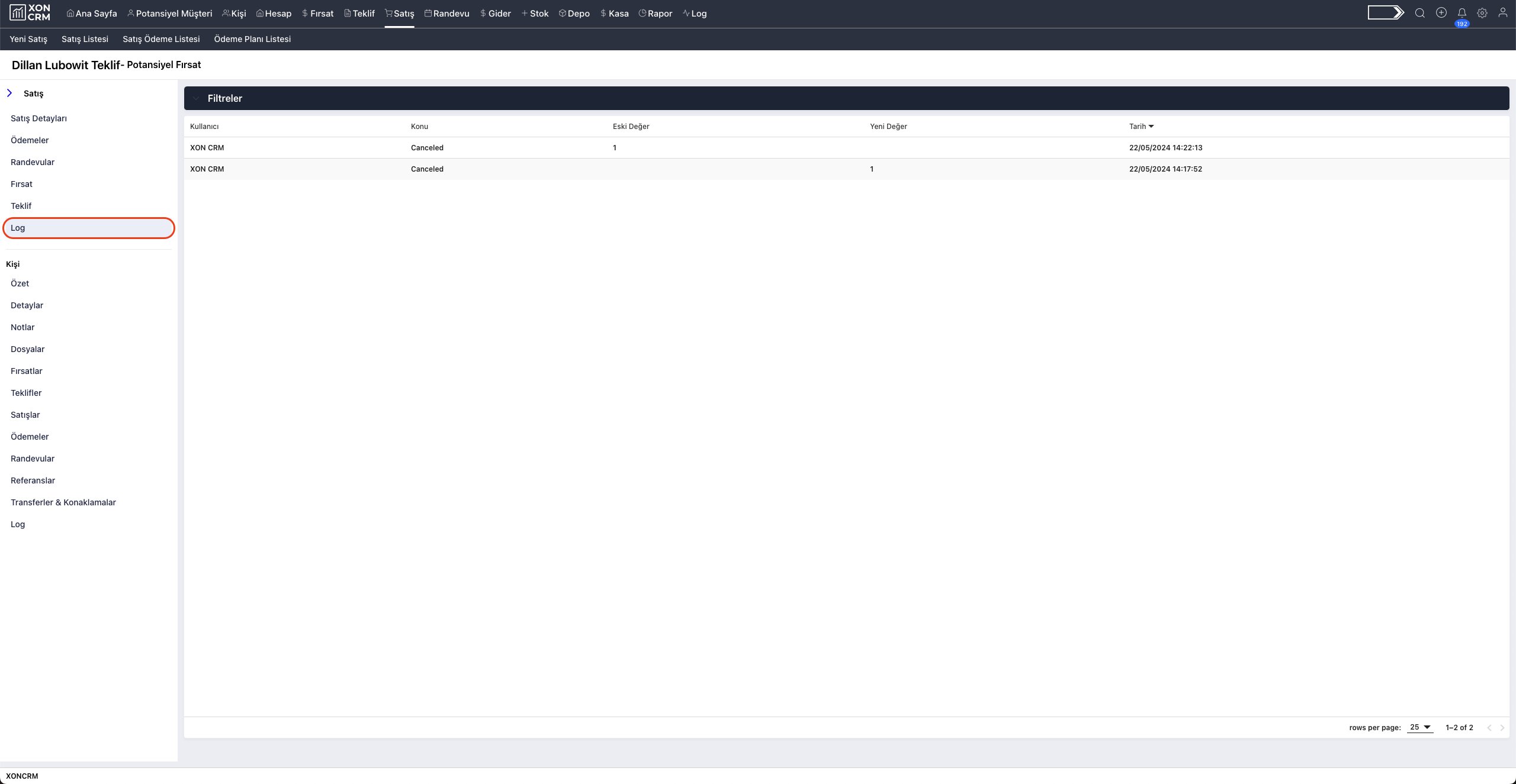 Satış log sayfasını açmak için; satış detay sayfasının sol tarafında yer alan “Log” seçeneğine tıklayınız. Açılan sayfada ilgili satış için yapılan güncellemeler listesi gözükecektir. Burda yer alan bilgiler:
